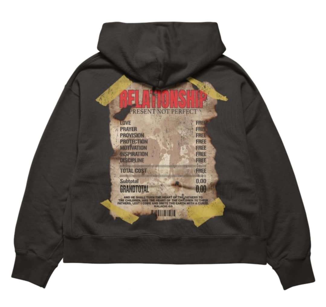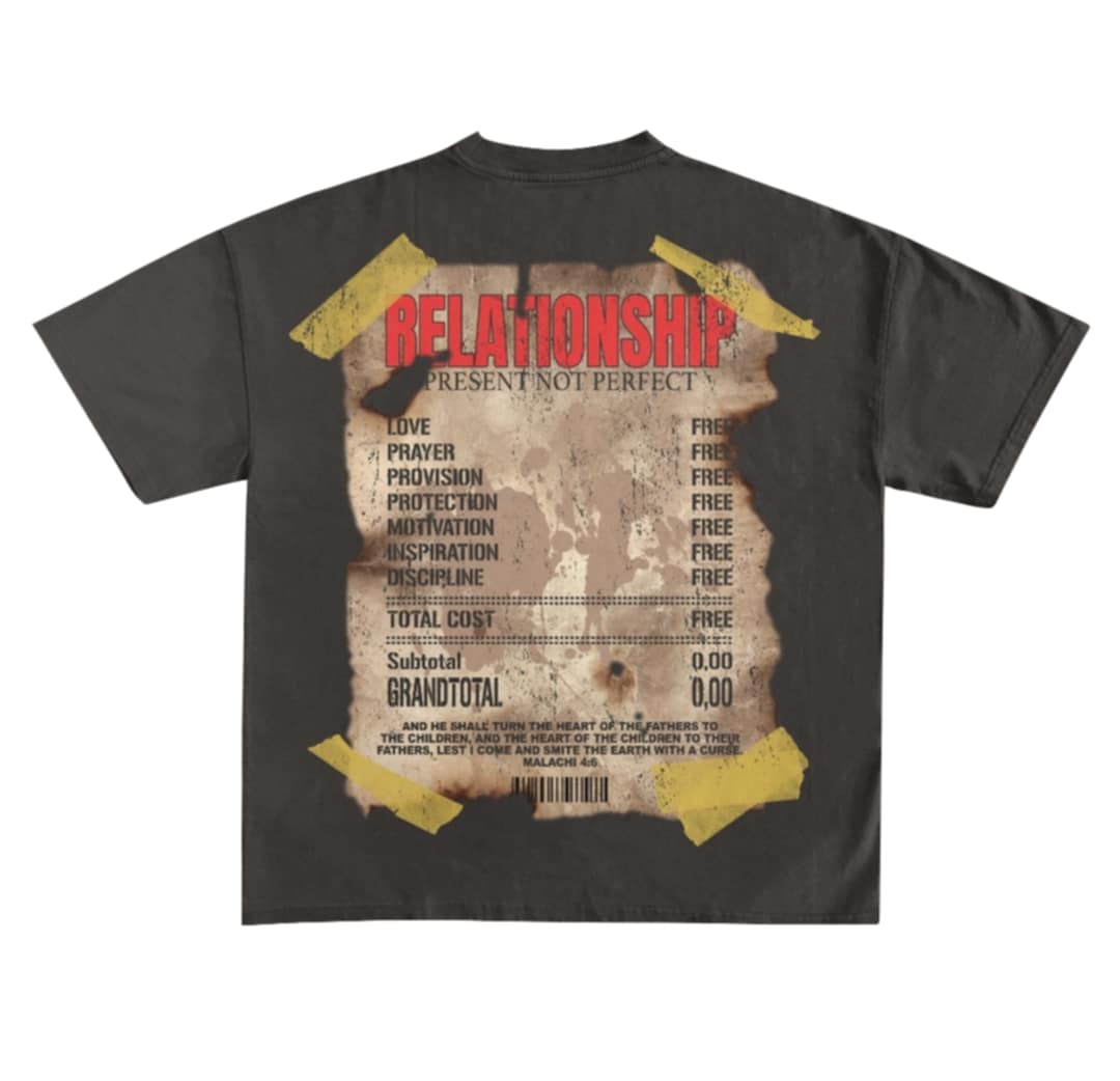 Relationship Tee: Present, Not Perfect Celebrate the value of fatherhood with the "Relationship: Present, Not Perfect" tee. The back design features a meaningful breakdown of what it means to be a father—offering love, prayer, protection, and more, all at no cost. Inspired by Malachi 4:6, this shirt is a powerful reminder that God is counting on fathers to guide their children. Wear it with pride, and represent fatherhood with intention and heart.